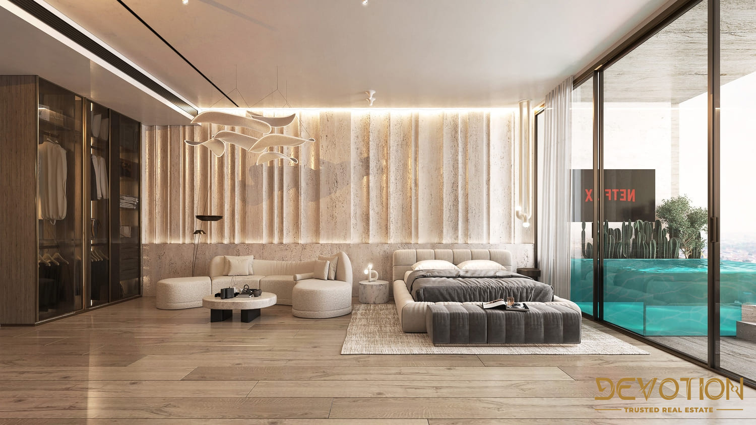 Rooftop terraces with infinity pools and outdoor cinema space