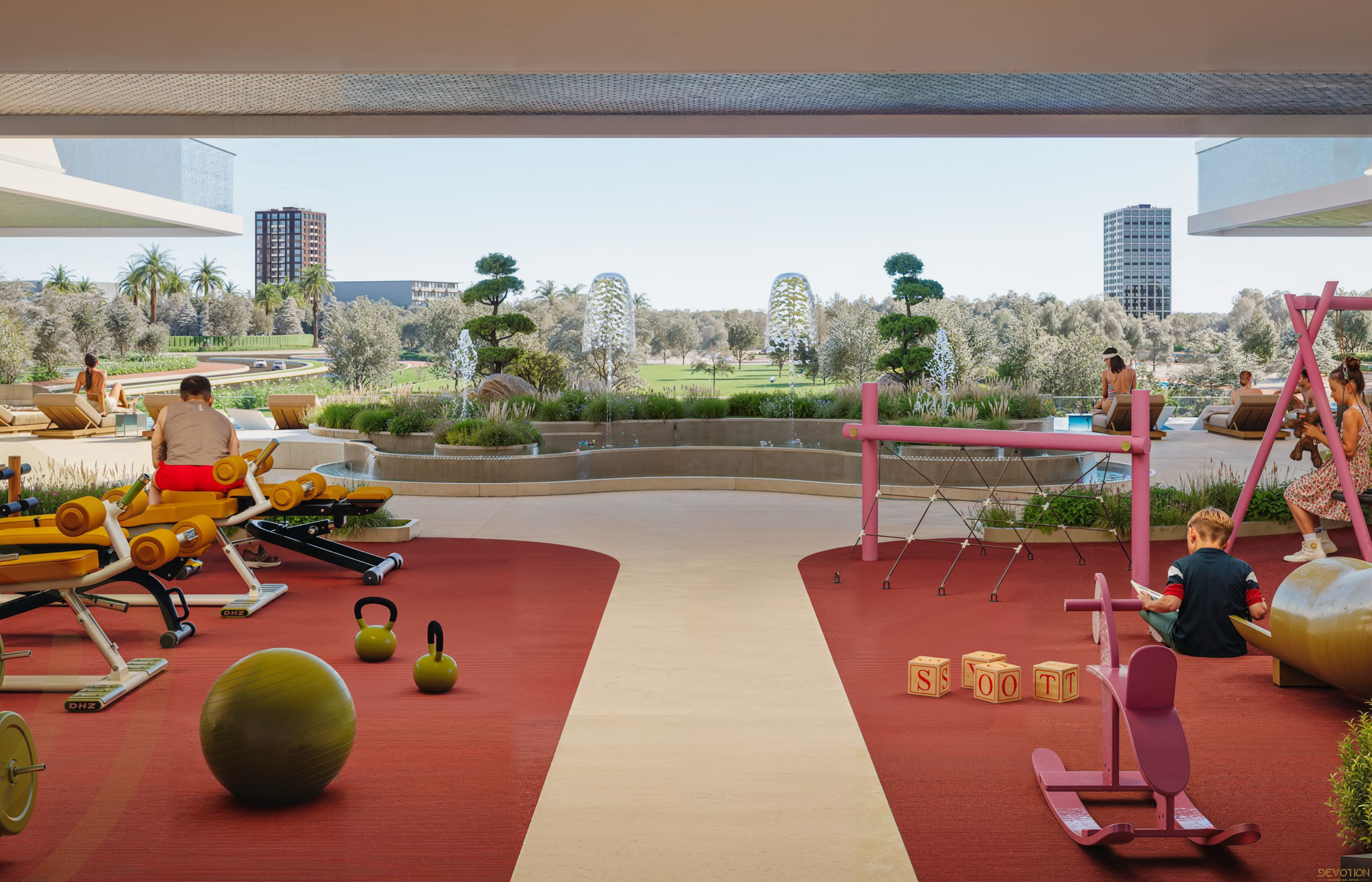 Jogging tracks, landscaped gardens, and kids’ play zones